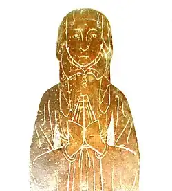 - ^ The inscription reads "Praye for the [soule, erased] of Be[th?] Butt'ry sūtyme Pryores of Campesse on whose soule Jesu have m'cy the xxiiij day of Octobr mvcxlvio." Two male pilgrims, holding staffs and rosaries, are shown seated at her feet.