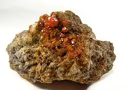 Campylite is a variety of the lead arsenate mineral mimetite which received the name from the Greek 'kampylos'- bent, on account of the barrel-shaped bend of its crystals. It has also been used as an alternate name for pyromorphite.