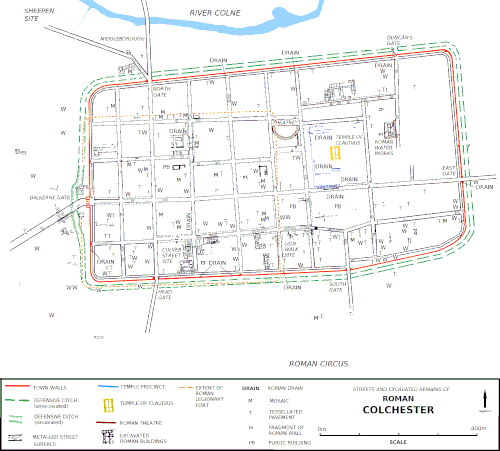 - ^ a b c d e f g h i j k l m n o p q r s t u v w x y z aa ab ac ad ae af ag ah ai aj ak al am an ao ap aq ar as at au av aw ax ay az ba bb bc bd be bf bg bh bi bj bk bl bm bn bo bp bq br bs bt bu bv bw bx by bz ca cb cc cd ce cf cg Crummy, Philip (1997) City of Victory; the story of Colchester – Britain's first Roman town. Published by Colchester Archaeological Trust (ISBN 1 897719 04 3)