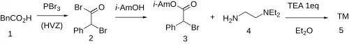 The Hell–Volhard–Zelinsky halogenation on phenylacetic acid [103-82-2] (1 ) gives 2-Bromo-2-phenylacetyl bromide, CID:15621041 (2 ). Treatment with isoamyl alcohol [123-51-3] gives 3-methylbutyl bromo(phenyl)acetate [92018-48-9] (3 ). Alkylation with N,N-Diethylethylenediamine [100-36-7] (4 ) completed the synthesis of Camylofin (5 ).