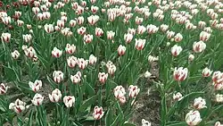 The Canada 150 tulip, also known as the Maple Leaf tulip, is the official tulip of the 150th anniversary of Canada and was unveiled May 9, 2016, in Commissioners Park.[2] The tulip was selectively bred with an elegant white flower and red flames, which resembles the flag of Canada.[3] In September 2016, tulip bulbs went on sale at Home Hardware stores.[4] For Canada's sesquicentennial celebration in 2017, the Canadian Tulip Festival in Ottawa planted over 200,000 Maple Leaf tulip bulbs.[4]