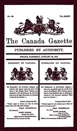 - ^ a b c Kennedy, Carole (2011-04-01) [2008-05-01]. "A Glance at the Canada Gazette: Past, Present and Future". Library and Archives Canada. Archived from the original on 23 February 2014. Retrieved 7 February 2014.