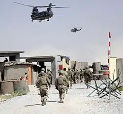 In February 2010, Canadian air forces and ground troops from 3PPCLI took part in the highly publicized Marja offensive.[22] In early 2010, Task Force Kandahar also contributed to creating the 3rd brigade of the 205th Afghan National Army (ANA) Corps that was deployed in Kandahar and Helmand province. In April 2010 the 1st Battalion Royal Canadian Regiment (1RCR), along with O Company of the 3rd Battalion Royal Canadian Regiment (3RCR), was deployed to relieve PPCLI in the southern districts of Kandahar province. In late May 2010, heavy fighting ensued and continued for much of the summer. During this time, two major operations involving about 160 troops along with two platoons of ANA were conducted under the name Operation Azida 1 and Operation Azida 2. 7 Platoon 3RCR's involvement in the operations over three months confronted them with as many as 75 skirmishes with Taliban forces, and approximately 50–75 improvised explosive devices (IEDs) were found. On one occasion, a Chinook helicopter was struck in flight by an insurgent RPG. This resulted in a hard landing, and destruction of the helicopter, but with no reported serious injuries. The violent clashes and skirmishes continued through the end of August, leaving O Company 3RCR and their combat attachments with over a dozen serious injuries.[23] Two weeks later Canadian Forces transferred Kandahar city to US forces, at which point most of Canada's forces were in the Panjwai district, Dand and Daman.[24] On 27 November 2010, in the tenth and final troop rotation, the 1st Battalion of the Royal 22e Régiment took over, marking the final rotation before Canada's withdrawal from Afghanistan.[25]