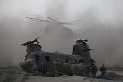 A US Marine CH-53E lands next to a downed Canadian CH-47 during tactical recovery of aircraft and personnel in Kandahar Province.