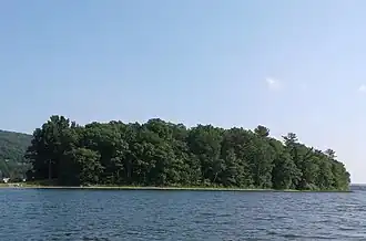 The lake has two islands. One island is known as Deowongo Island. The island's name is said to mean, "Place of Hearing", coming from the Oneida Iroquois nation’s language, and was given to the island because of the echo that was noticeable from that body of land. The island was protected in October 2012 and is currently open for public access. The other island is Loon Island which is a sunken island that disappeared in the early 19th century.[6][7]
