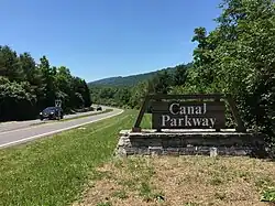Canal Parkway, which carries the unsigned Maryland Route 61 (MD 61) designation, is a state highway and automobile parkway in the U.S. state of Maryland. The road begins at the West Virginia state line at the North Branch Potomac River opposite Wiley Ford, where the highway continues south as West Virginia Route 28 (WV 28). The parkway runs 1.94 miles (3.12 km) north to MD 51 within the city of Cumberland. Canal Parkway provides a connection between downtown Cumberland and the South Cumberland neighborhood and with Greater Cumberland Regional Airport, which is located in Mineral County, West Virginia.