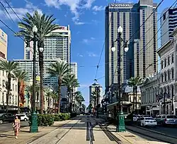 Both business and government leaders in New Orleans have taken steps over the past 50 years to encourage development and corporate centered business in the city. These began with the construction of the Superdome using public money, choosing not to build an expressway along the Mississippi River in the French Quarter and allowing the riverfront to be developed for tourism, and the under used wharves made available by the New Orleans public port authority for non-maritime use in the 1960s.[7] These decisions opened the door for changes in land use, encouraging business, especially that of the tourism industry, for the city. The downtown New Orleans segment of Canal Street has been undergoing redevelopment along the lines called for in the Downtown Development District's Canal Street Vision and Development Strategy (2004). In recent years the street has welcomed the addition of numerous new anchor enterprises, including the Ritz-Carlton New Orleans, luxury apartments at 1201 Canal, the New Orleans Bio-Innovation Center, the rehabilitated Joy Theater, the Saint Hotel, the Audubon Nature Institute's Audubon Insectarium, and the Astor Crowne Plaza. In October 2011, the New Orleans City Council granted final approval for the construction of 1031 Canal, a 190-foot (58 m) multi-use high-rise at the northeast intersection of Canal and North Rampart Streets.[8] The building, under construction as a Hard Rock Hotel, was the site of a partial building and crane collapse on October 12, 2019.