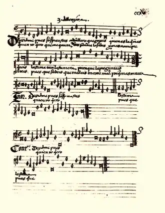 - Free scores from Cancionero de Palacio in the Choral Public Domain Library (ChoralWiki)