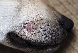 Canine demodicosis is a common parasitic skin disease in dogs caused by the excessive proliferation of the hair follicle mite Demodex canis. It can occur locally or all over the body. Demodicosis in older animals only occurs in connection with disorders of the immune system, in young animals the development of the disease is not fully understood. Demodicosis usually begins with hair loss and without itching. As the disease progresses, a secondary bacterial infection can lead to severe skin changes up to purulent skin inflammation (pyoderma). The disease is detected by microscopic detection of mites. Treatment is carried out with mite-effective medication.[1]