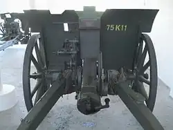 The Cannone da 75/27 modello 11 was a French-designed field gun produced in Italy prior to World War I.[1] It was introduced in 1912, designed by Joseph-Albert Deport. It was taken into service by Italy for use with its infantry divisions into World War I, and was built there in large numbers. The gun was designed with two notable features. It was the first artillery piece to introduce the split trail, as well as the last to utilize its novel dual-recoil system. The former became a very popular feature on artillery pieces through to the modern day. The later, while functional, did not get repeated. The dual-recoil system consisted of a small tubular recoil under the barrel which in turn traveled in a traditional rectangular cradle. This lessened heat transfer from the gun barrel to the recoil mechanism effectively, but was not necessary for the added complexity.[5]