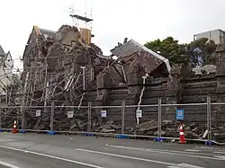 The buildings were substantially damaged in the February 2011 Christchurch earthquake.[7] The stone tower on Armagh Street, which acted as the buildings' entrance on their north side and which held the clock of the Victoria Clock Tower in the early years, collapsed.[8] Dr Ian Lochhead, Associate Professor of Art History at the University of Canterbury, said that the Stone Chamber was for many the single biggest heritage loss of the February earthquake. Lochhead, who was an advisor for the restoration of the buildings from 1981, called for the reconstruction of the Stone Chamber.[9] Detailed engineering assessments showed that the buildings received so much damage that significant portions would have to be rebuilt. A report was due to be given to Christchurch City Councillors in June 2013 outlining the options.[10]