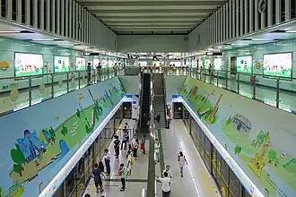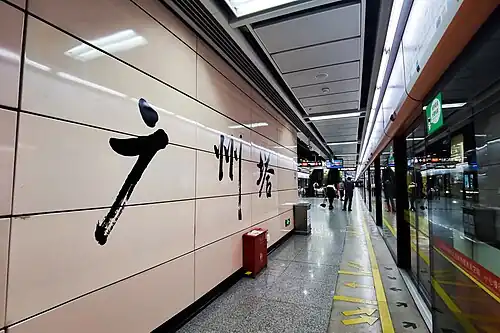 Canton Tower station (simplified Chinese: 广州塔站; traditional Chinese: 廣州塔站; Cantonese Yale: Gwóngjāu Taap Jaahm) is an interchange station between Line 3 and the APM line of the Guangzhou Metro. It is also the southern terminus of the APM line. It started operations on 28 December 2005. It is an underground station located to the south of Binjiang Road East[1] in Haizhu District, on the south bank of the Pearl River.