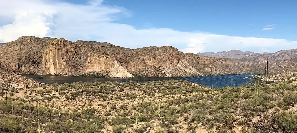 Canyon Lake is one of four reservoirs that were formed by the damming of the Salt River in the U.S. state of Arizona as part of the Salt River Project. It was formed by the Mormon Flat Dam, which was completed in 1925 after two years of construction. Canyon Lake, with a surface area of 950 acres (380 ha), is the third and smallest of the four lakes created along the river. Two others, Apache Lake and Roosevelt Lake, are upstream. The fourth, Saguaro Lake, is downstream.