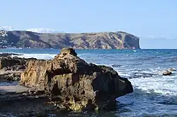 It is part of the Montgó Natural Park, while the surrounding waters are part of the Cape Sant Antoni Marine Reserve, and there are two plant micro-reserves on land, one at the north cliff face, and the other on a nearby isle.[5][6] At its tip is an out-of-use lighthouse first operated in 1855, built in an area with several small buildings including a former lookout tower that formed the basis for the lighthouse. Formerly there was also a small 14th-century chapel or hermitage dedicated to Sant Antoni.[7] As of 2020, the lighthouse is soon to be converted into an interpretation center (information center) for the Marine Reserve.[8]