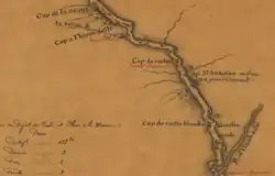 The French explorers and mapmakers used the word cape (or in French, "cap") to describe the bluffs and promontories along the Mississippi River. A "cap" could sit next to any body of water, not just the ocean.[4] Spanish authorities also used the term cabo (cape) for points on the Mississippi River. Along the Mississippi River between St. Louis and Cairo there are a number of capes of French origin.[5]