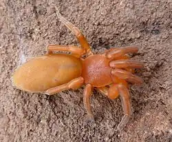 Caponia, also called eight-eyed orange lungless spiders, is an Afrotropical genus of araneomorph spiders in the family Caponiidae, first described by Eugène Simon in 1887.[2] As the common name implies, these spiders have a tightly arranged set of eight eyes, as opposed to the related two-eyed genus Diploglena, and breathe using two pairs of tracheae rather than book lungs. They are agile, nocturnal hunters, that hide by day in a variety of silk-lined retreats.[3]