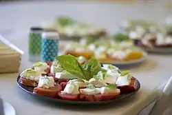 Caprese salad (Italian: insalata caprese, pronounced [insaˈlaːta kaˈpreːze; -eːse]) is an Italian salad prepared with sliced fresh mozzarella, tomatoes, and sweet basil and seasoned with salt and olive oil. It is usually arranged on a plate in restaurant practice.[1][2][3] Like pizza Margherita, it features the colours of the Italian flag: green, white, and red. In Italy, it is usually served as an appetiser (antipasto), not a side dish (contorno), and it may be eaten any time of day. Caprese salad is one form of a caprese dish; it may also be served as a pizza caprese, pasta or sandwich.