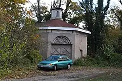 The Baxter House stands one block off the downtown area of the village of Hyannis, on the south side of South Street at its junction with Pearl Street. The house is located on the west side of its lot, with the smaller carriage house to the east. The house is two stories, with stuccoed concrete walls 18 inches (46 cm) thick, and a bracketed flat roof topped by an octagonal cupola. Two of its eight sides have entrances: the one facing the street is a simpler entrance sheltered by a bracketed hood, while that facing east is sheltered by a single-story porch extending across that facade, with a spindled balustrade and turned posts. Most of the other facades have two windows on each level; some have only one. The interior of each level has a central square chamber, around which are four smaller rectangular chambers, with the remaining triangular spaces used as closets. The carriage house, one story in height has a similar exterior finish and a smaller footprint, and is topped by smaller octagonal cupola. A two-leaf vehicle entrance is topped by a half-round fan; both the fan and the doors have strap woodwork decoration.[2]