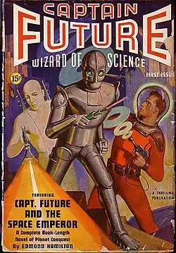 Although science fiction (sf) had been published before the 1920s, it did not begin to coalesce into a separately marketed genre until the appearance in 1926 of Amazing Stories, a pulp magazine published by Hugo Gernsback. By the end of the 1930s, the field was booming.[2] Better Publications, a pulp magazine publisher which had acquired Thrilling Wonder Stories in 1936, launched three new magazines as part of this boom. The first two were Startling Stories, which appeared in January 1939, and Strange Stories, which began the following month; both were edited by Mort Weisinger, who was also the editor of Thrilling Wonder Stories.[3] Edmond Hamilton, an established science fiction writer, met with Leo Margulies, Better Publication's editorial director, in early 1939, and they subsequently planned the launch of a new magazine with the lead character of Curt Newton, a super-scientist who lived on the moon and went by the name "Captain Future".[4] The original idea for the character may have come from Weisinger.[5] Margulies announced the new magazine at the first World Science Fiction Convention, held in New York in July 1939, and the first issue, edited by Weisinger, appeared in January of the following year.[4][6] Captain Future's companions in the series included an enormously strong robot named Grag, an android named Otho, and the brain of Simon Wright, Newton's mentor. Joan Randall, Newton's girlfriend, was also a regular character. Better Publications followed up the magazine launch with a companion comic, Startling Comics, which appeared in May 1940; Captain Future was the protagonist of the lead story.[7] Weisinger left in 1941 to edit comics following the adventures of Superman, and was replaced by Oscar J. Friend.[6]