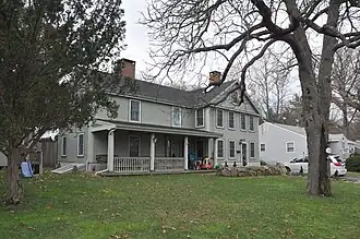 The Captain Goodwin–James Eustis House is located west of downtown Wakefield, at the junction of Elm and Prospect Streets. It is a 2+1⁄2-story wood-frame structure, with a cross-gable roof, and mostly clapboarded exterior. It has a main block with a four-bay gabled facade, and a two-story section on the left side that is suspected to be of older construction. The main block's entrance is in the center-right bay, and its gable is fully pedimented, with a flushboarded central tympanum. The side ell is fronted by a single-story shed-roof porch, with round columns and a spindled balustrade.[2]