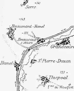 1. ^ From 7 to 13 June 1915, the French Second Army attacked a German salient on a 1.2 mi (1.9 km) front at Toutvent Farm near Serre, against the 52nd Division and gained 3,000 ft (900 m) on a 2 km (1.2 mi) front, leaving a salient known as the Heidenkopf north of the Auchonvillers–Beaumont Hamel road, at a cost of 10,351 casualties, 1,760 being killed; German casualties were c. 4,000.[12]