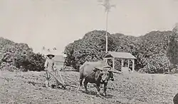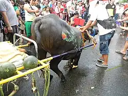 The traditional equipment used with the carabao is a plow or harrow attached to the animal by a yoke. In modern times, carabaos are also used to plow fields for crops that grow on dry land, like corn, sugarcane, or upland rice.[22][23] Another older method of preparing fields with the carabao is known as payatak, which is still practiced by some farmers in Northern Samar. In payatak, the soil of the rice paddy is first softened with rainwater or diverted watershed, then the farmer guides a group of carabaos in trampling the planting area until it is soggy enough to receive the rice seedlings. This time-consuming task produces lower yields and lower income when compared with the advancement in irrigated fields.[24]