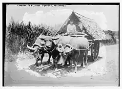 Carabaos were also widely used for transporting goods in the past, usually via a carabao sled (kangga) or a two-wheeled cart (gareta or careton, also spelled kareton or kariton, from Spanish carretón). The kangga is typically used for rocky or muddy terrain, and has the advantage of being capable of traveling over rice paddy dikes without destroying them. The careton, on the other hand, is typically reserved for traveling on roads. The careton come in various designs and can be covered in a roof of woven split bamboo (sawali) or thatched nipa palm leaves (pawid).[25][26]