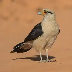 Caracaras are birds of prey in the family Falconidae. They are traditionally placed in subfamily Polyborinae with the forest falcons,[1] but are sometimes considered to constitute their own subfamily, Caracarinae,[2] or classified as members of the true falcon subfamily, Falconinae.[3] Caracaras are principally birds of South and Central America, just reaching the southern United States.