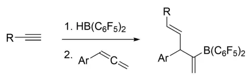 - ^ Averdunk, A.; Hasenbeck, M.; Müller, T.; Becker, J.; Gellrich, U. (2022). "1,2-Carboboration of Arylallenes by In Situ Generated Alkenylboranes for the Synthesis of 1,4-Dienes". Chemistry - A European Journal. 28 (32): e202200470. doi:10.1002/chem.202200470. PMC 9325554. PMID 35348257.