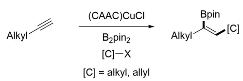 - ^ Gao, Y.; Kim, N.; Mendoza, S. D.; Yazdani, S.; Vieira, A. F.; Liu, M.; Grotjahn, D. B.; Bertrand, G.; Jazzar, R.; Engle, K. M. (2022). "(CAAC)Copper Catalysis Enables Regioselective Three-Component Carboboration of Terminal Alkynes". ACS Catalysis. 12 (12): 7243–7247. doi:10.1021/acscatal.2c00614. PMC 10153597. PMID 37143933.