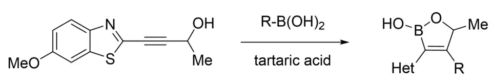 - ^ a b c d Roscales, S.; Csákÿ, A. G. (2015). "Transition-Metal-Free Direct anti-Carboboration of Alkynes with Boronic Acids To Produce Alkenylheteroarenes". Organic Letters. 17 (6): 1605–1608. doi:10.1021/acs.orglett.5b00517. PMID 25738233.