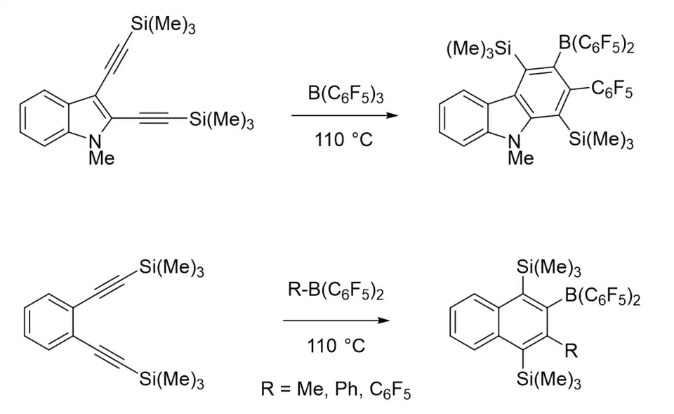- ^ Wrackmeyer, B.; Kehr, G.; Suß, J.; Molla, E. (1999). "1,1-Organoboration of tetraynes—routes to new siloles, stannoles and fused heterocycles". Journal of Organometallic Chemistry. 577: 82. doi:10.1016/S0022-328X(98)01029-8.