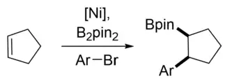 - ^ a b Wang, W.; Ding, C.; Li, Y.; Li, Z.; Li, Y.; Peng, L.; Yin, G. (2019). "Migratory Arylboration of Unactivated Alkenes Enabled by Nickel Catalysis". Angewandte Chemie International Edition. 58 (14): 4612–4616. doi:10.1002/anie.201814572. PMID 30740847. S2CID 73450688.