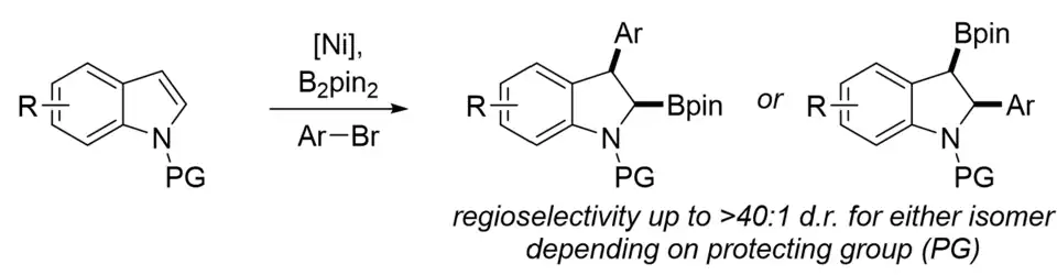 - ^ Trannel, G. L.; Kuniyil, R.; Crook, P. F.; Liu, P.; Brown, M. K. (2021). "Nickel-Catalyzed Dearomative Arylboration of Indoles: Regioselective Synthesis of C2- and C3-Borylated Indolines". Journal of the American Chemical Society. 143 (40): 16502–16511. doi:10.1021/jacs.1c05902. PMC 8781163. PMID 34582691.