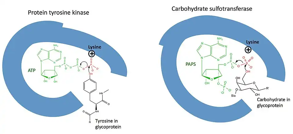 The exact mechanism used by sulfotransferases is still being elucidated, but studies have indicated that sulfotransferases use an in-line sulfonyl-transfer mechanism that is analogous to the phosphoryl transfer mechanism used by many kinases, which is logical given the great level of structural and functional similarities between kinases and sulfotransferases (Figure 2).[9] In carbohydrate sulfotransferases a conserved lysine has been identified in the active PAPS binding site, which is analogous to a conserved lysine in the active ATP binding site of kinases.[10][11] Protein sequence alignment studies indicate that this lysine is conserved in cytosolic sulfotransferases as well.[4]