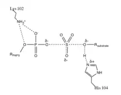 In addition to the conserved lysine, sulfotransferases have a highly conserved histidine in the active site.[12] Based on the conservation of these residues, theoretical models, and experimental measurements a theoretical transition state for catalyzed sulfation has been proposed (Figure 3).[12]