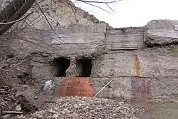 Upstream from the canal, much activity was underway during the 1940s to address the challenges at the Scofield Dam. As noted above, the dam had started to deteriorate significantly during the late 1920s. The outlet tunnel had failed numerous times, and an embankment was eroding away. On May 21, 1928, a beaver tunneling into the dam nearly caused the entire dam to fail.[6] In an emergency effort to decrease the pressure on the dam, the spillway was lowered several feet; it was lowered another 7.5 feet a few years later and then again in 1942.[6]