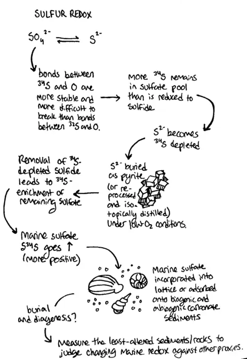 Carbonate-associated sulfate (CAS) represents a small fraction of seawater sulfate, buried (and to some extent, preserved) with carbonate sediments. Thus, the changing δ34S value of CAS through time should theoretically scale with the changing amount of reduced sulfur species being buried as metal-sulfides and the correspondingly enriched ocean. The enrichment of marine sulfate in 34S should in turn scale with things like: the level of oxygen in the oceans and atmosphere, the initial appearance and proliferation of sulfur-reducing metabolisms among the world's microbial communities, and perhaps local-scale climate events and tectonism.[51][52][37] The more positive the δ34S of marine sulfate, the more sulfate reduction and/or burial/removal of reduced, 34S-depleted sulfur species must be occurring.