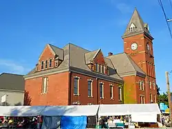 Carbondale City Hall and Courthouse, also known as the Carbondale Municipal Building, is a historic city hall and courthouse building located at Carbondale, Lackawanna County, Pennsylvania. It was built in 1892–1894, and is a brick and bluestone building in the Romanesque-style. It consists of five-story, square, corner tower; three-story wing; and two-story brick wing. The three-story wing, along with the tower, houses the Carbondale City Hall. It features a massive, half-circle primary entrance and rusticated stone and brick turrets. The two-story wing was built in 1859 as the courthouse, and incorporated into the new building.[2]