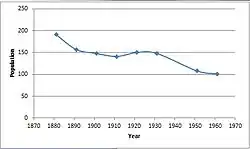 Data from the 1881 Census shows that the population was 191 in 1881,[6] which then decreased by about 35 in the 1891 Census.[7] The population continued to decrease with the 1911 Census revealing a population density of 141.[8] However data from the 1921 Census shows a population increase to 150,[9] with 71 males and 77 females.[10] By the 1931 Census the population had fallen again by 2 to 148,[11] but the 1951 Census shows a drastic decrease with a population of 108.[12] By the 1961 Census the population had fallen to 101,[13] with 54 males and 47 females.[14]
