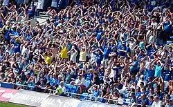 Cardiff has a large catchment area from which to draw its supporter base. With only two professional teams (Swansea City and Newport County) sharing the South Wales region, the club enjoys considerable support from both the city of Cardiff and the surrounding South Wales Valleys.[78] As a Welsh club playing in the English football league system, national identity is believed to be a major factor in fan support, and some of the club's matches are considered to be Welsh cross-border rivalries with England.[78][79] During the 1980s, as the club struggled in the lower divisions of English football, crowds dropped to an average of 3,000 per match. An increase in the club's fortunes saw a steady improvement in crowd numbers. The average attendance at home matches rose from 3,594 to 12,522 between 1997 and 2002.[80] Promotion to the second tier in 2003 brought further increases in numbers. The opening of the Cardiff City Stadium led to average attendances reaching 20,000 fans, culminating with highs of between 28,000 and 31,000 during two seasons in the Premier League.[81][82] Despite this increase, the club has often been regarded as attracting fewer spectators than similarly placed teams. This has been attributed to several factors such as the club's controversial change to red shirts between 2012 and 2015—some supporters being perceived as fairweather fans, and a lack of atmosphere.[81][83]