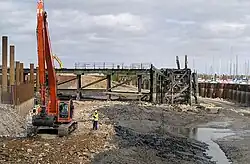 In November 2008, a 180-tonne crane was constructed on the site in order to start work on a temporary dam that held back the water while four large pumps were installed. The crane was then floated on a pontoon in the River Ely to create a retained water pool separating the course from the river.