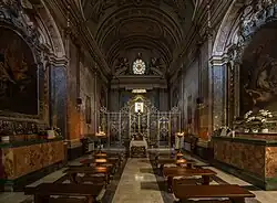 In 1587, when the church of Sts Sergius and Bacchus in the Roman Forum was suppressed as a cardinal deaconry, and the church demolished, it was succeeded by a renovated Sts Sergius and Bacchus in Monti. In 1622 it was entrusted by Pope Gregory XV (1621–23) to the Minim Friars of St. Francis of Paola who soon left it when they moved to another church near San Pietro in Vincoli.[4][6] The church was renovated under Pope Urban VIII (1623–44), through the patronage of his younger brother, Capuchin Cardinal Antonio Marcello Barberini (1569–1646, cardinal from 1624). [4] [6] Above the travertine doorway, the only part of the seventeenth century façade surviving today, is an inscription that records this work: