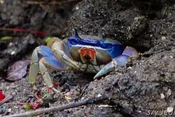 Cardisoma guanhumi, also known as the blue land crab or great land crab, is a species of land crab found in tropical and subtropical estuaries and other maritime areas of land along the Atlantic coast of the Americas from Brazil[2] and Colombia, through the Caribbean and Gulf of Mexico, to the Bahamas, and north to Ponce Inlet, Florida,[3] Princess Place Preserve in Palm Coast, and Bermuda.[4] The species varies in colour from dark blue to brown or pale grey, and may grow to 15 centimetres (6 in) in carapace width and weigh over 500 grams (18 oz).[3][5]