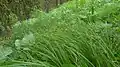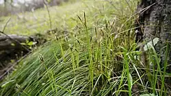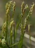 Carex geyeri is a species of sedge known by the common names Geyer's sedge and elk sedge. It is native to western North America from British Columbia to California to Colorado, where it grows in dry areas in mountain meadows, grasslands, and open forest. This sedge produces scattered tufts of stems connected by a network of long rhizomes. The stems are triangular in cross-section and approach half a meter in maximum height. The inflorescence is composed of a cluster of staminate flowers and a cluster of pistillate flowers separated by a node.