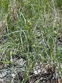 The sedge has a rhizome that runs parallel to the ground sprouting new tufts. It has two or three thin culms with a triangular cross-section that grow to a height of 30 to 60 cm (12 to 24 in). The culms are mostly smooth but have a rough texture on the upper portion. The culms are surrounded by bladeless sheaths with a red-brown colour near the base that deteriorate over time into a mass of fibers.[3]