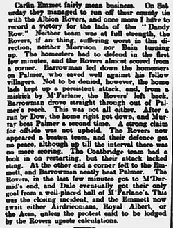 The new club's first match was a 3–2 win at Mossend Swifts in August[6] and then beat Albion Rovers in the first round of the Scottish Qualifying Cup; Rovers protested on the basis that Emmet lacked a private ground,[7] but sent a wire to the Scottish FA on the day of the committee meeting to withdraw it.[8] Emmet drew twice with Motherwell in the second, but, whereas in previous years both clubs would have been put through to the third, the Scottish FA had changed the regulations, requiring a second replay, to take place at neutral ground (Hamilton).[9] At the third time of asking, the Scottish League club won through 3–2, the winner coming ten minutes from the end.[10]