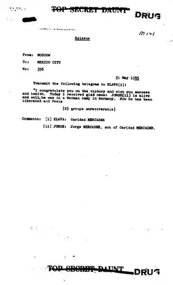 Mercader achieved some notoriety as a member of the Unified Socialist Party of Catalonia (Partit Socialista Unificat de Catalunya, PSUC). In 1936 she led a propaganda mission to Mexico[7][8] and later became an agent of the NKVD in Spain.[9] Her son Ramón, also a member of the PSUC and an officer in the Spanish Republican Army, was also recruited by Soviet espionage during the war, likely with the involvement of his mother. Under orders from Josef Stalin, as part of Operation Utka (Operation Duck), Ramon Mercader was enlisted and trained to assassinate Leon Trotsky, who was in exile in Mexico.[10] Caridad, who had settled in Paris some time in 1937, also participated in the operation.[11] When Ramón was arrested after murdering Trotsky, Caridad managed to leave Mexico and escape to the Soviet Union, where she was received with honors,[12] awarded the Order of Lenin. The Hero of the Soviet Union was reserved for Ramon upon his release from a Mexican prison. In the Soviet Union, Caridad actively participated in conflicts between the different factions of exiled Spanish communists, including with Dolores Ibárruri, La Pasionaria.[13]