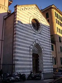 Romanesque-Gothic in form, it has a black-and-white striped facade, typical of 14th-century Genoese architecture, made by alternating slabs of white marble and slate. The central rose window, destroyed by bombs, was rebuilt in 1953. The one-nave interior has an exposed wooden truss roof, rebuilt in 1950, while the square apse is surmounted by a rib vault. Some late 15th-century frescoes depicting the four evangelists are visible in the masonry vaults.[4]