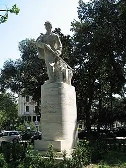 Halfway down Via Corsica, in the square named after shipowner Rocco Piaggio, is the monument to Nino Bixio, the work of Guido Galletti,[25] erected in 1952 to replace the 19th-century one by Enrico Pazzi, which was destroyed by bombing in 1940.[5] The Church of the Sacred Heart and St. James of Carignano (Luigi Rovelli, 1898) overlooks this square.[8] At No. 4 Via Corsica was the headquarters of Italsider. The massive gray-green marble building that housed the offices of the historic steel company, designed in 1931 by Giuseppe Crosa di Vergagni, has housed a hotel since the early 2000s. On the facade of No. 6 stands the recently restored plaque in memory of Luigi Arnaldo Vassallo, better known by the pseudonym Gandolin.[2][26]